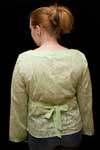 Long sleeved green top with ribbon details under bust and around sleeves. Features a side zip and tie back. Coordinating bag made with 100% cotton, featuring solid handles and plain lining.
